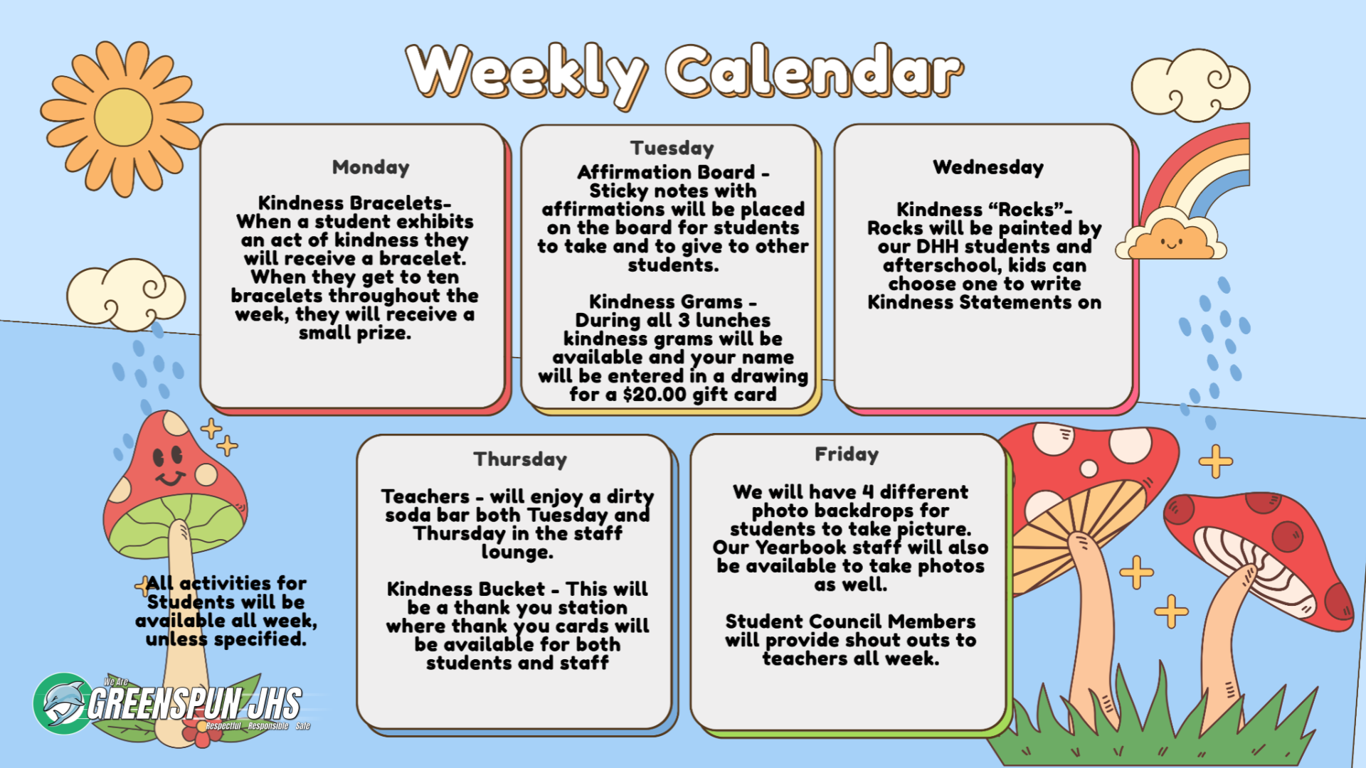Kindness Week: Kindness week is here! we have several activities that our students can participate in this week. Take advantage of photo ops in the hallways, or words of affirmation. You can even send a note to a friend during your lunch period and receive an entry for a $20.00 Amazon gift card. We are Greenspun! We are Kind; We are Respectful; We are Responsible; We are Safe!