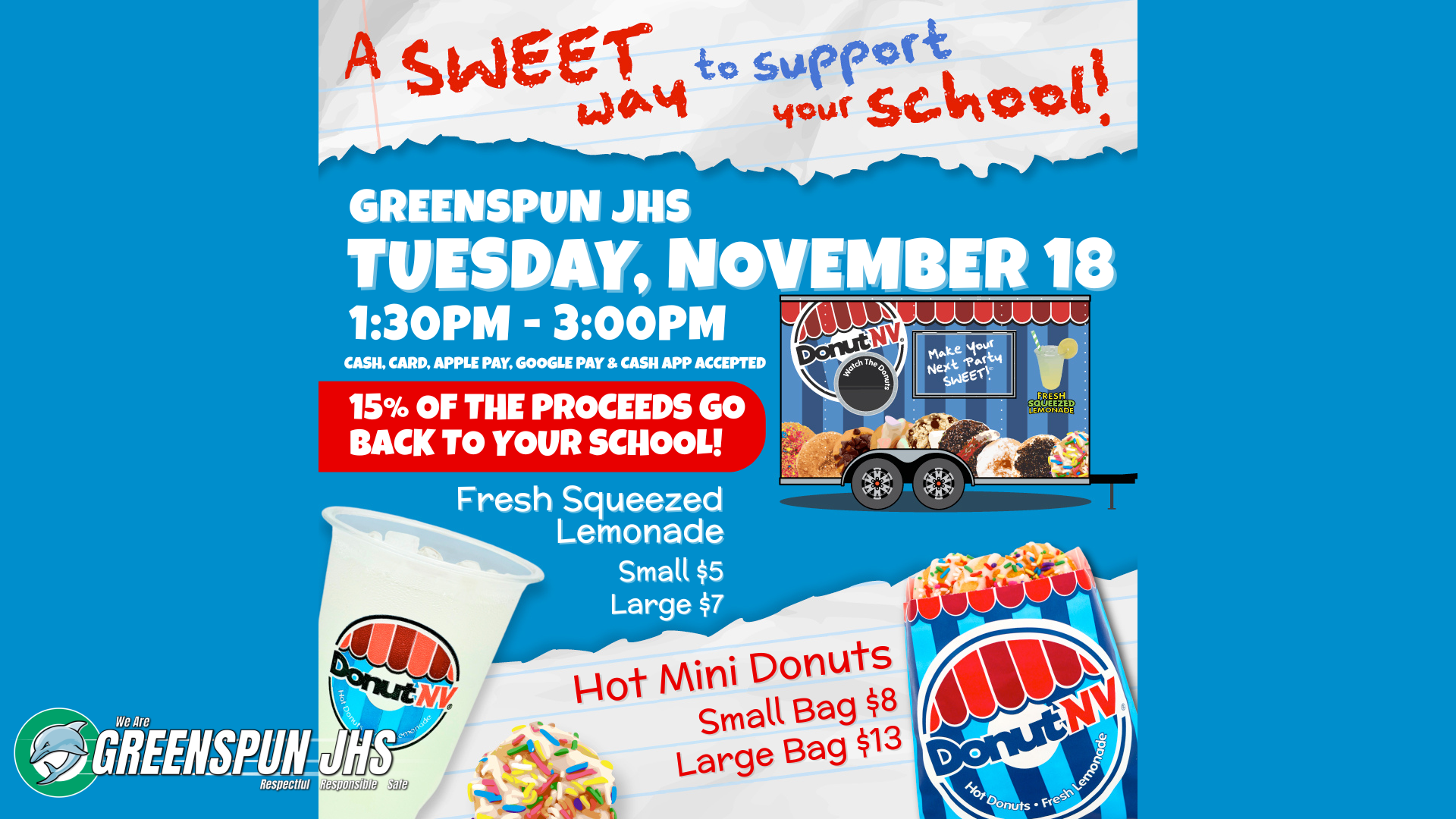 DONATIONS PLEDGE: Please click here to pledge a donation. In order for this event to be successful, we are asking our Greenspun families to help us by donating pies and whipped cream. You may pledge by clicking the link under the "Donations Pledge" section. You may drop off donations to the front office anytime on Monday, November 24, 2025.