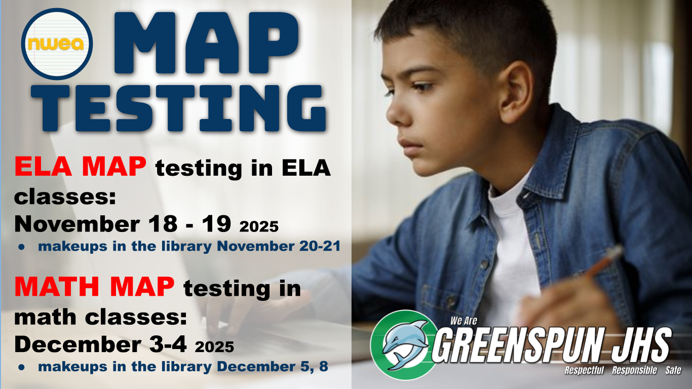 MAP Testing: MAP testing begins November 18-19 in ELA classes, and December 3-4 for Math classes. Measures of Academic Progress (MAP) is a computer-adaptive assessment utilized to monitor student growth to inform and personalize instruction. For more information, please visit https://www.greenspunjhs.com/assessment