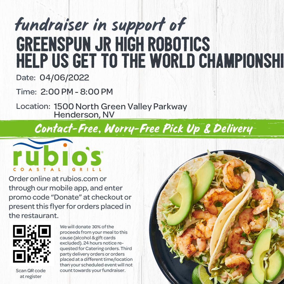 Rubios Fundraising Event for GJHS Robotics: Thank you all for your fundraising support to help us to be able to send our qualifying robotics teams to the World Championships in Dallas, TX! The robotics teams will continue selling Boba tea in the cafeteria on Fridays during all lunches, and we will be hosting a fundraising event at Rubio’s at 1500 N. Green Valley Pkwy on Wednesday, April 6 from 2pm - 8pm. Come and enjoy a delicious Rubios dinner, and 30% of the proceeds will be donated to the Greenspun robotics team!