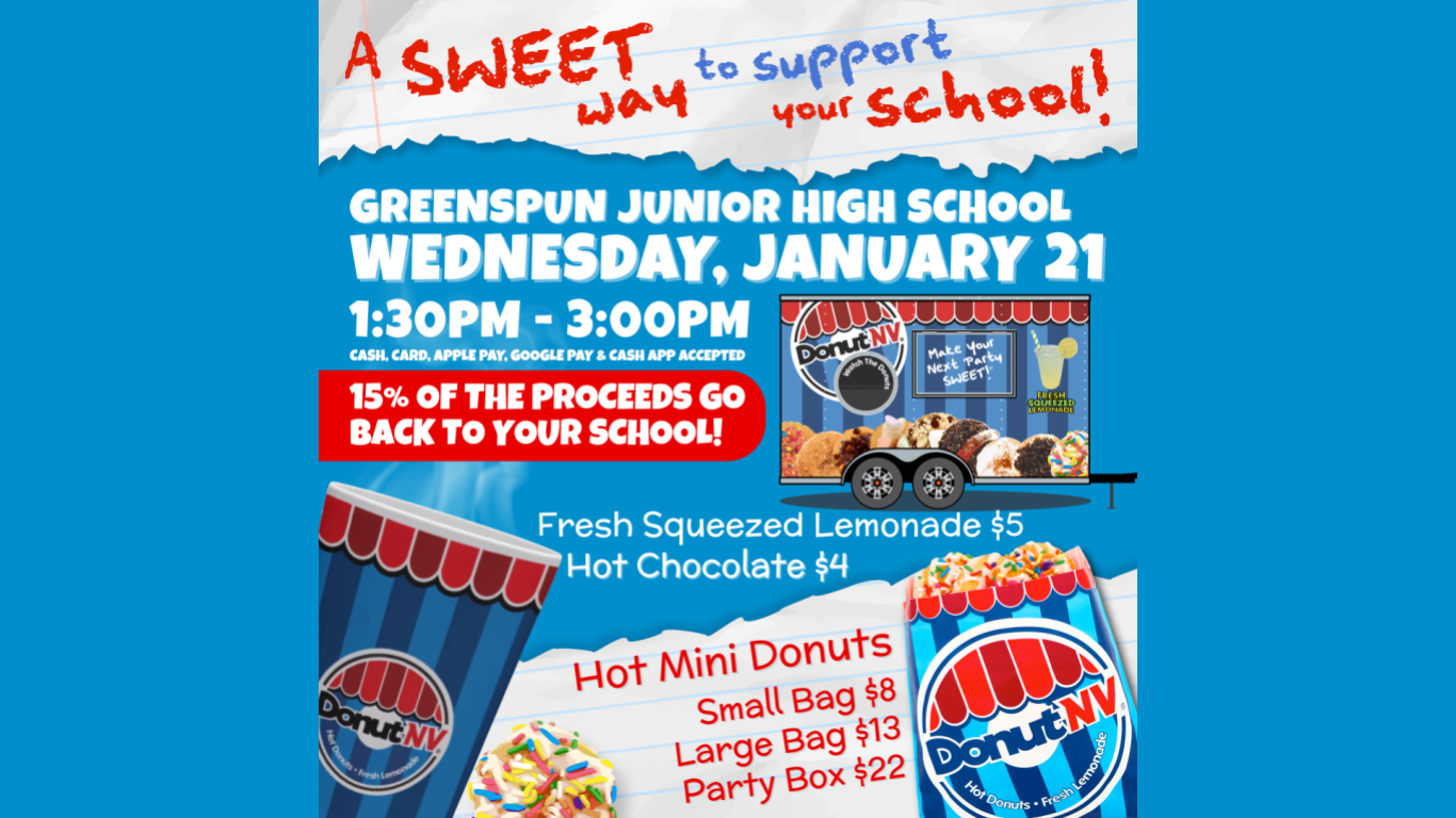 BIRTHDAY GREETINGS: Do you want an easy and fun way to celebrate your child's birthday at school? For $15, we will display a short message on the outdoor digital marquee to help celebrate the day. Additionally, a bag of treats and a personalized birthday card will be delivered to your child during the school day. All funds raised help support Greenspun clubs and activities. CLICK HERE to submit a birthday greeting for your child!