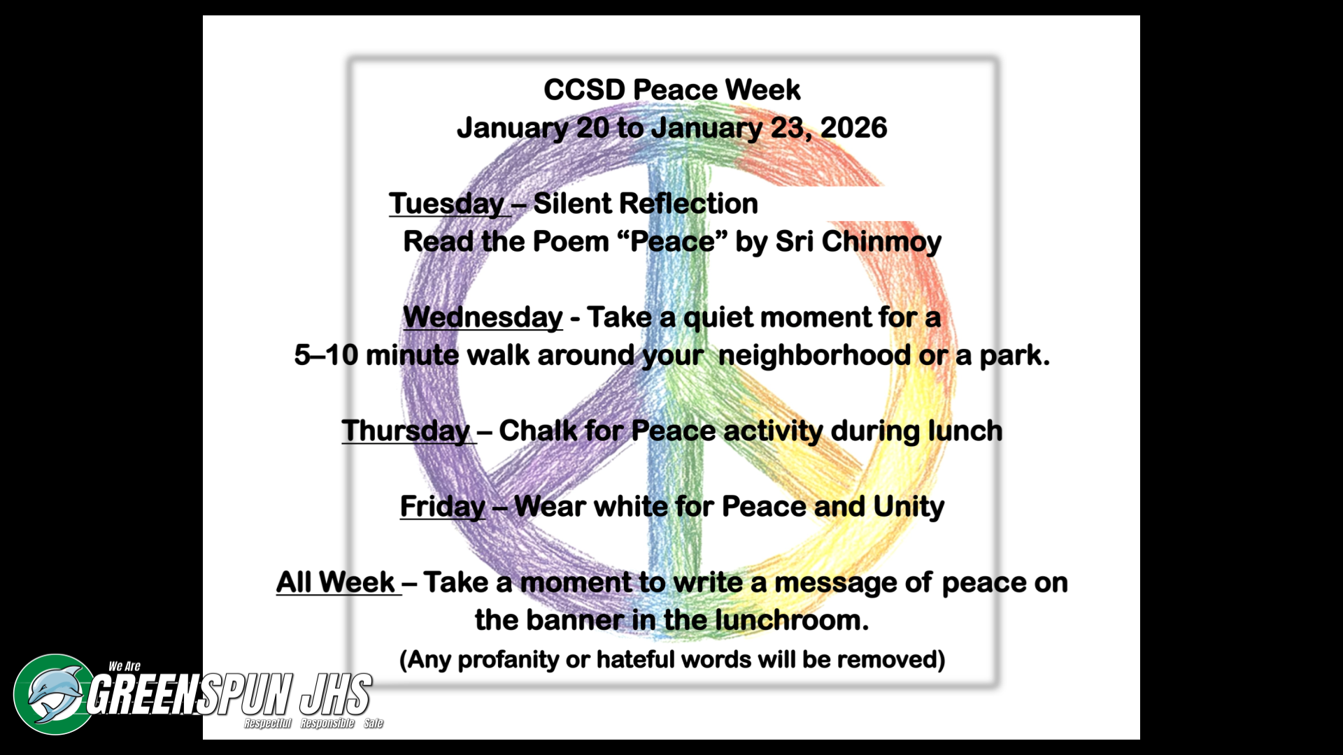 CCSD Peace Week: January 19–23, 2026, is designated as Peace Week in the State of Nevada. Peace education aspires to enable students to become responsible citizens who are open to differences and capable of empathy and solidarity within and across communities and social groups. The focus extends to deconstructing the foundations of violence and taking action to advance the prospects of peace.